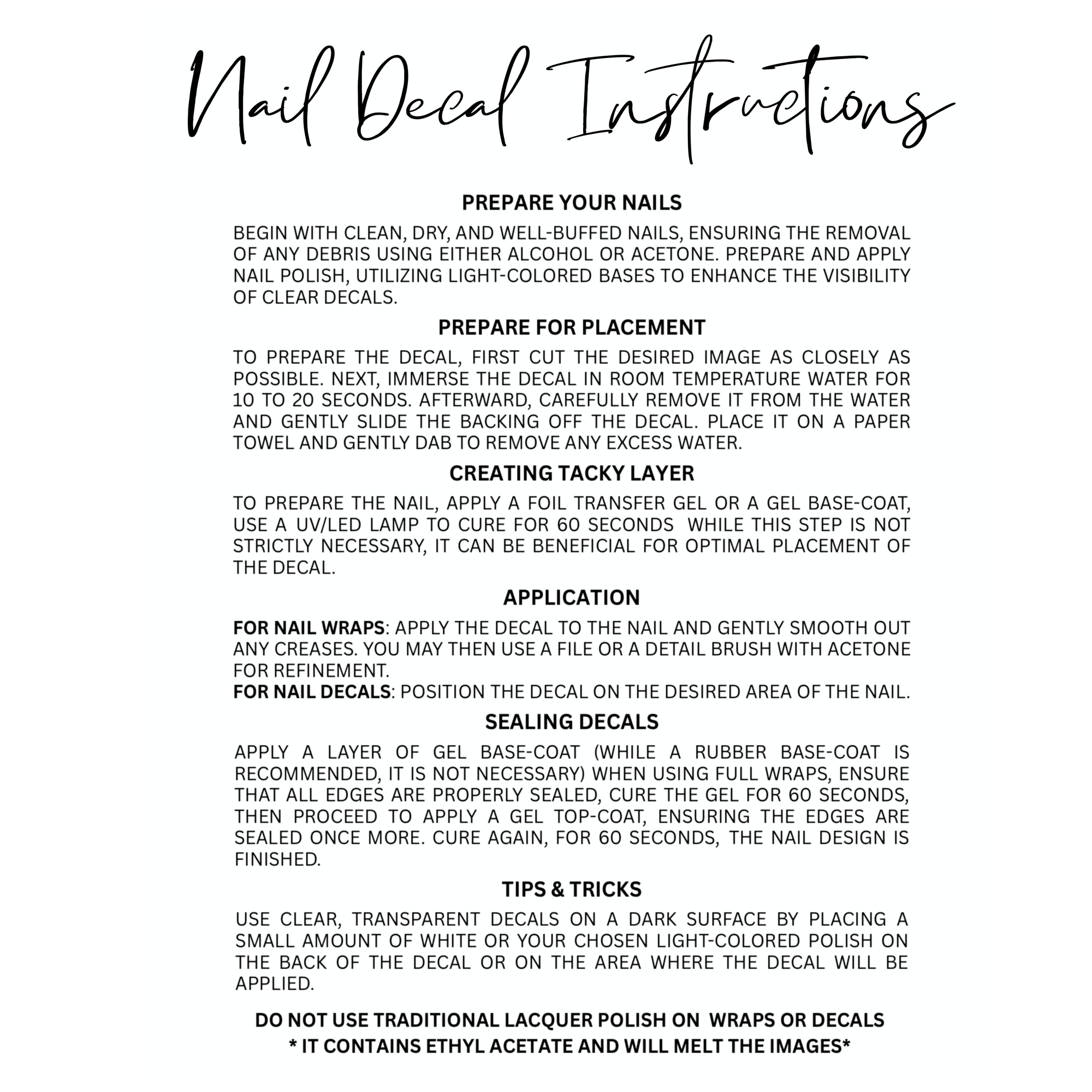 All decals are customizable to fit and can be used with all nail systems ( Natural Nails - Acrylic Nails - Hard Gel Nails - Press On Nails )